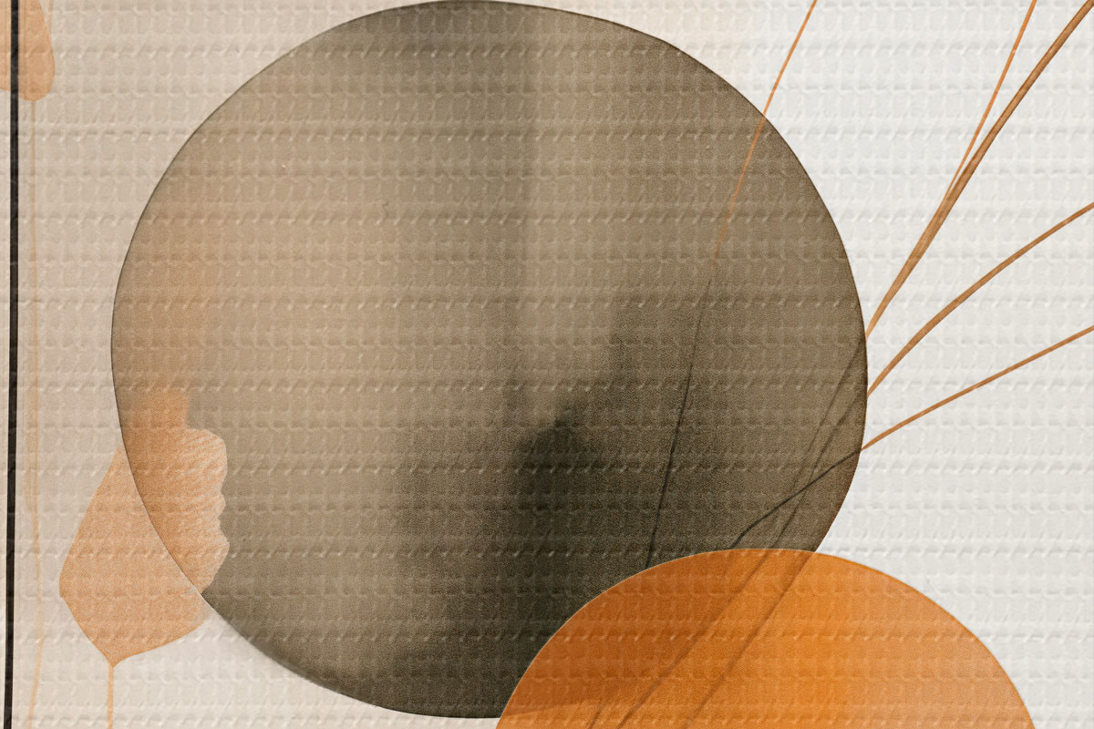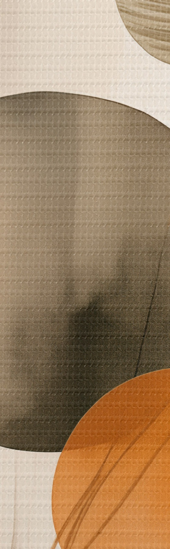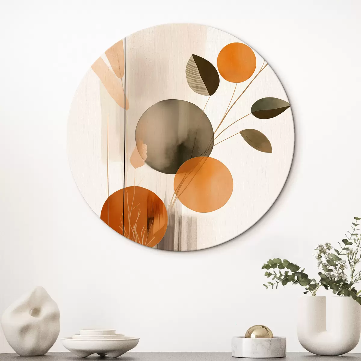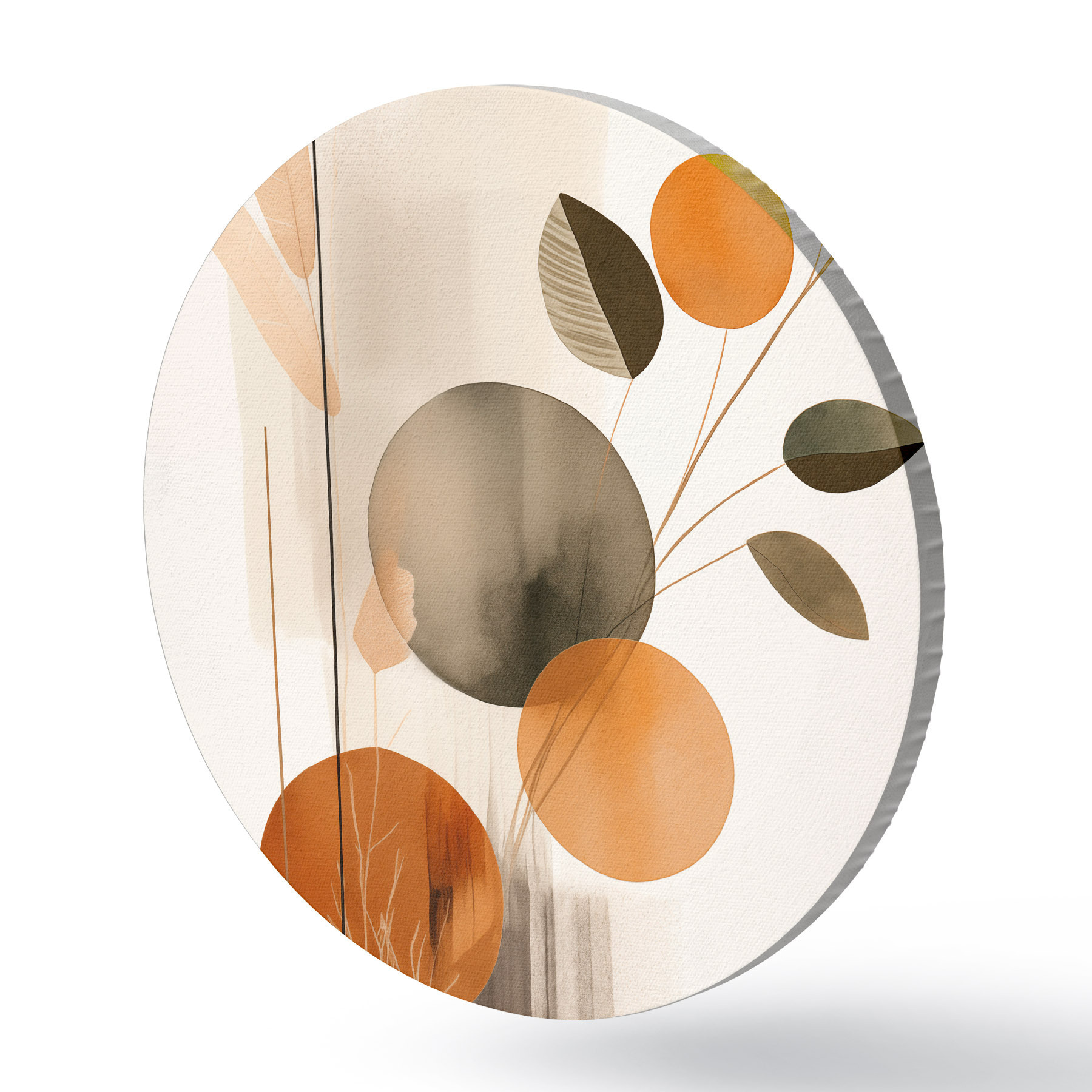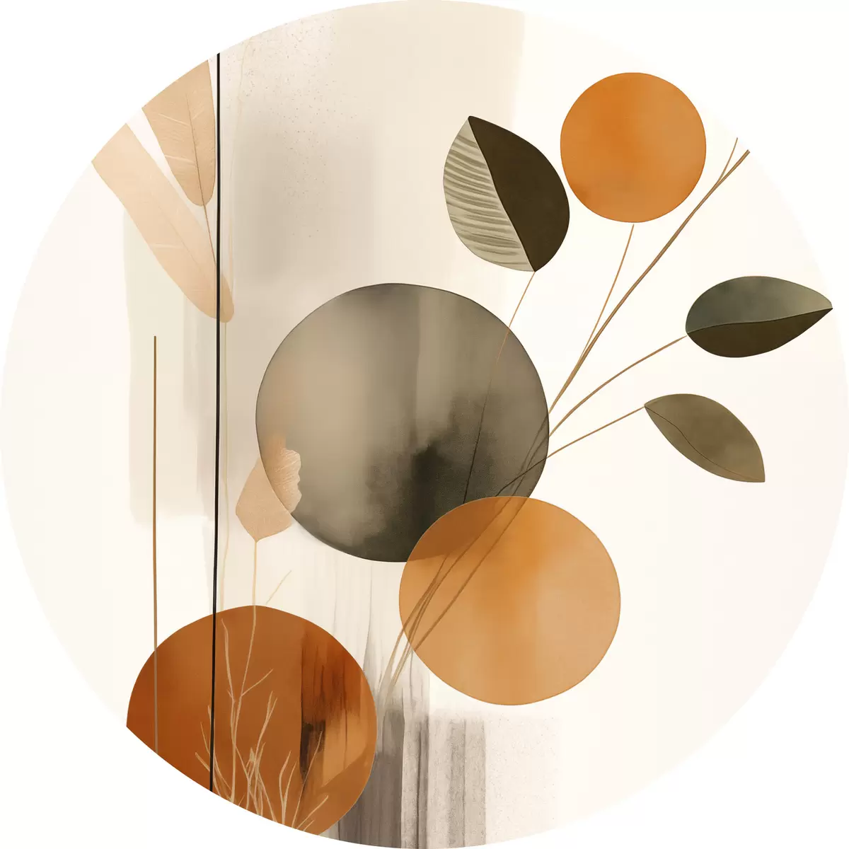 Pilt Abstraktne maal, millel on oranžid ja hallid ringid, lehed ja oksad, modernne stiil, akvarelliefekt Nr r46697