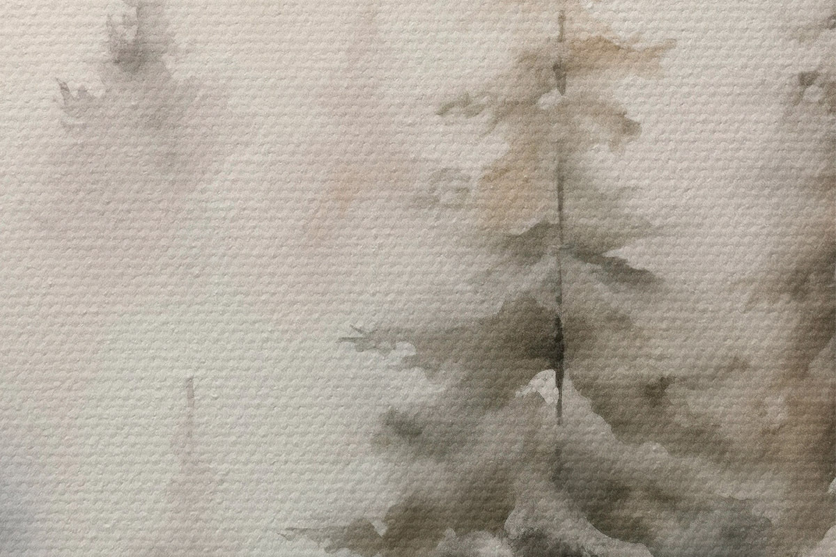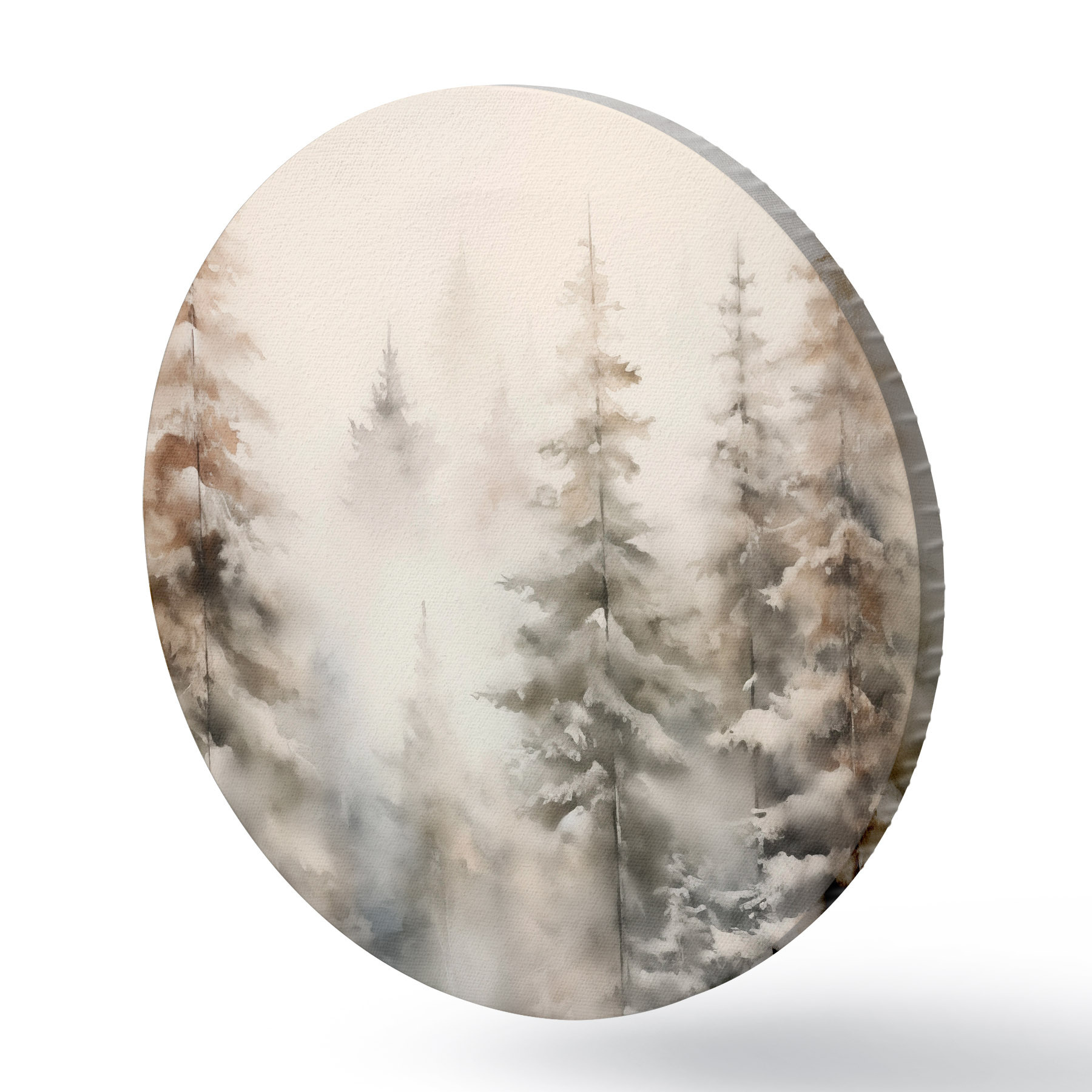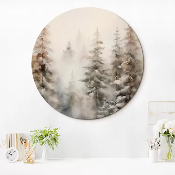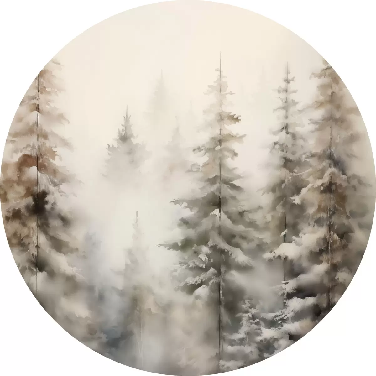 Pilt Lumega kaetud kõrged männipuud, mis seisavad uduses metsas, pehme, vaikselt talvine stseen Nr r46701