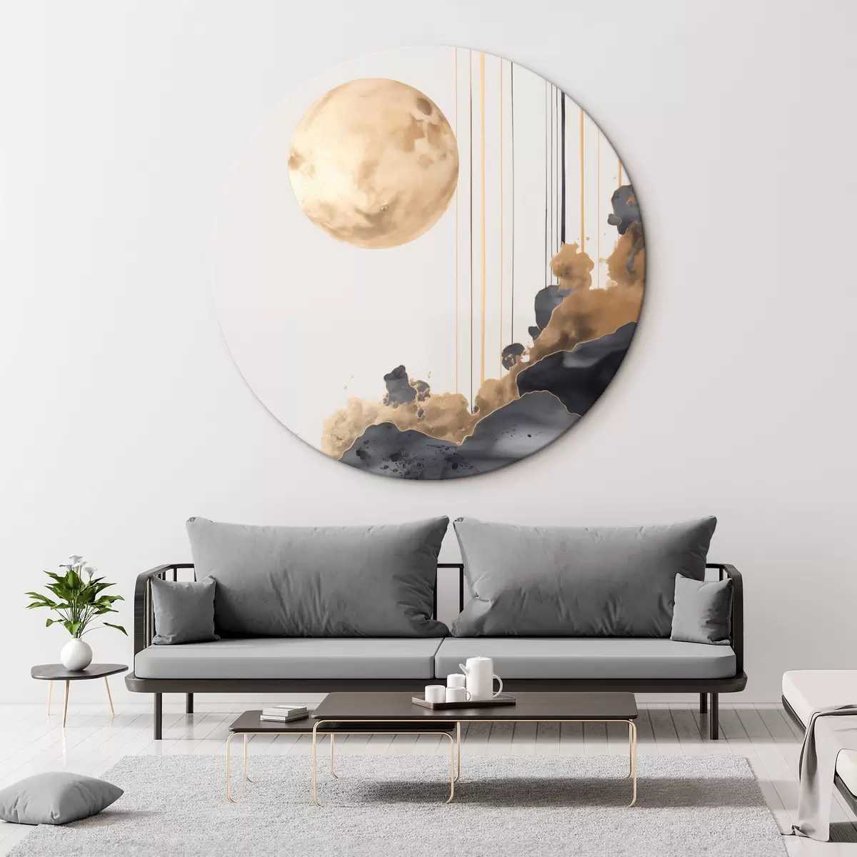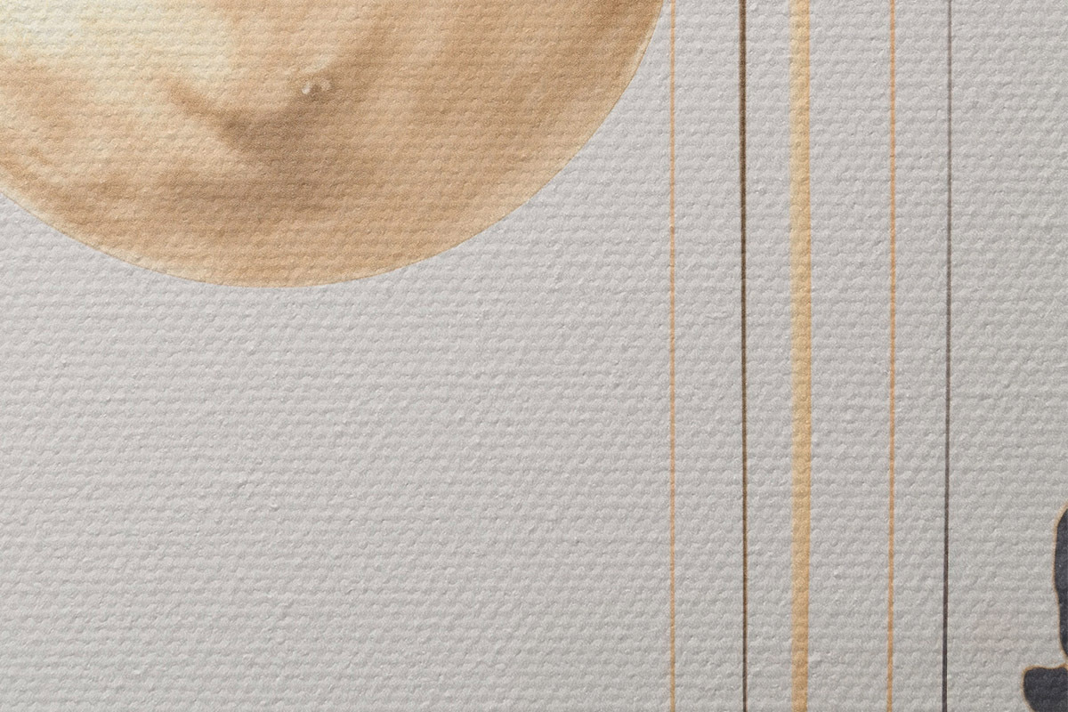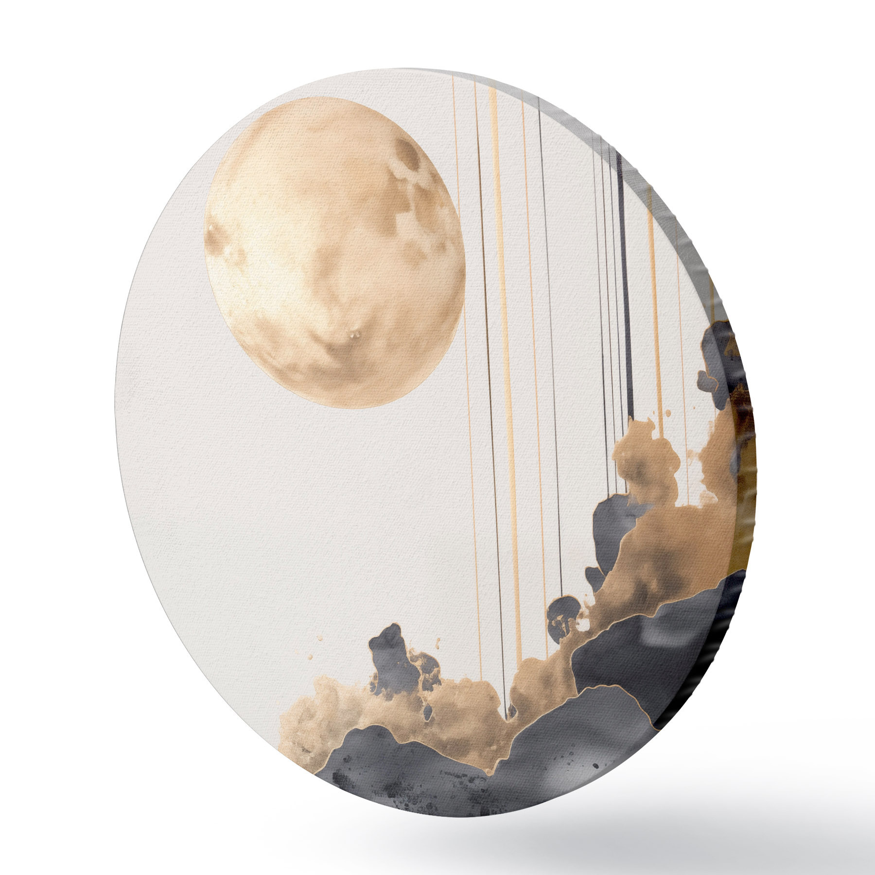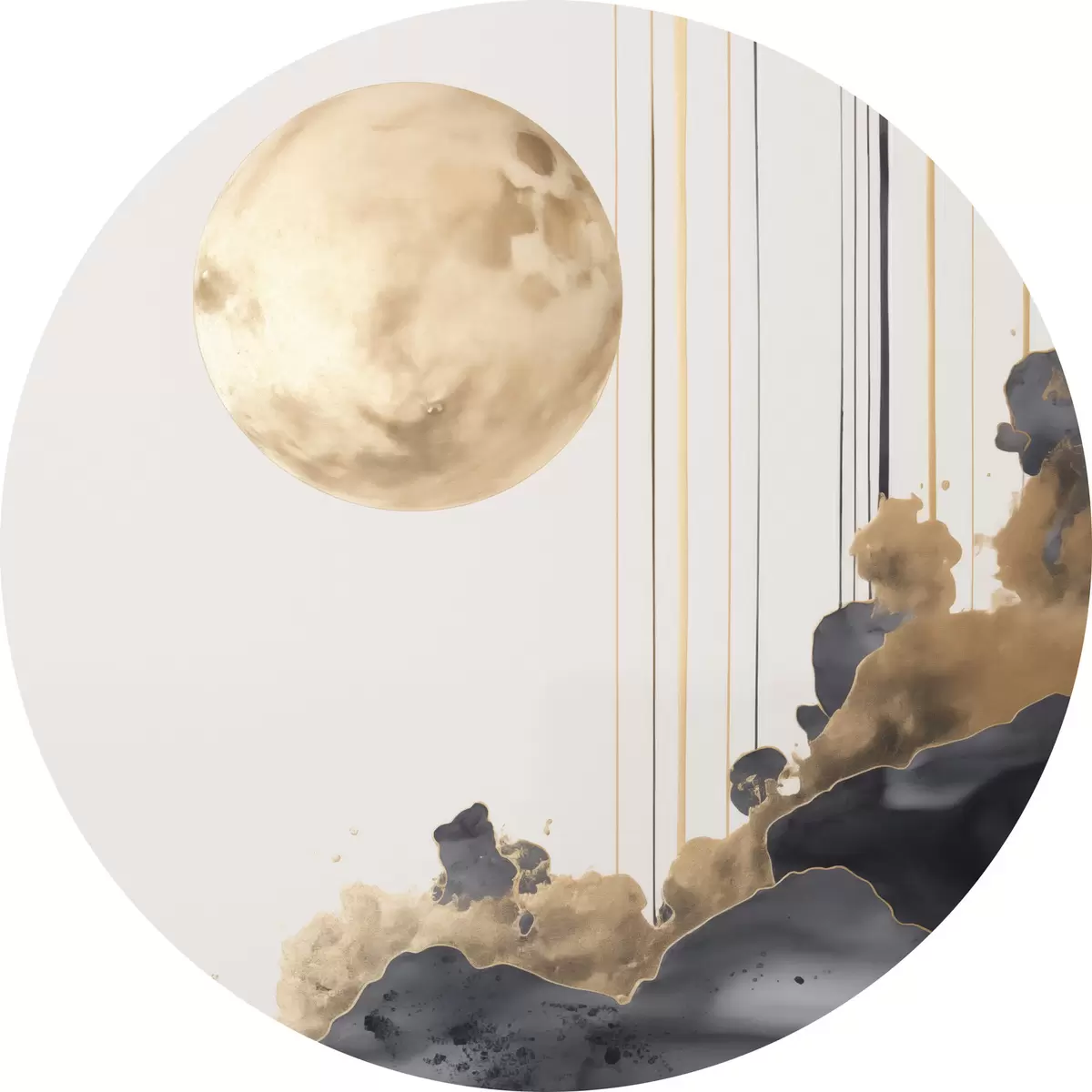 Pilt Täiskuu mustade ja tekstuuriga kollaste pilvedega, vertikaalsed jooned, abstraktne stiil, minimalistlik ja modernne Nr r46707